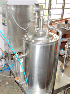 This filling system is ideal for liquids such as edible oil, liquid chocolate, araldite which require precise dozing and need to be adjusted for various package sizes. The Filling valves give a positive settable volume dose of the product to be filled. The dose is accurate up to ±2 ml/grams on the set volume. The volume dosing piston is controlled and moved by cam track or by air cylinder. There is a No Bottle-No fill system in place to prevent any wastage. The bottles are raised to the filling nozzle by positive lift cylinder, if the bottle is not delivered the valve does not open. The product will be filled to preset volume and the bottle is lowered. The tank and all rubber components are designed to work at high temperatures.